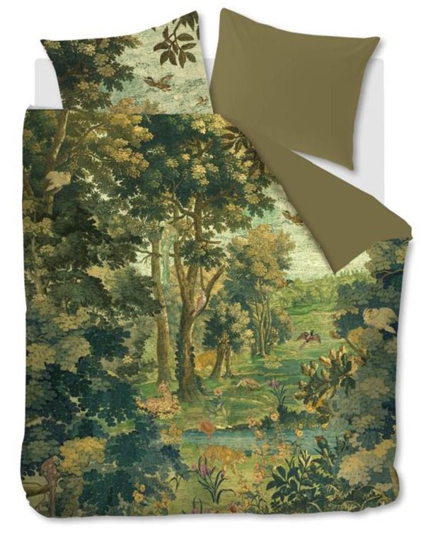 De At Home by Beddinghouse-collectie combineert warme kleuren met diverse kwaliteiten, die je slaapkamer een rijke, sfeervolle uitstraling met geheel eigen karakter geven. Dekbedovertrek Idyllic heeft een afbeelding van een idyllisch, botanisch landschap. De geprinte structuur geeft het idee van een luxe wandtapijt. In de tekening zijn verschillende dieren zichtbaar die bij het water samen komen. Zo kun je onder andere een tijger, hert, schildpad, pauw en verschillende soorten vogels in de prachtige afbeelding terugzien. De achterkant van het dekbedovertrek heeft een mooie bijpassende mosgroene kleur. Dit overtrek komt perfect tot zijn recht in een comfortabele, sfeervolle en karakteristieke slaapkamer.
